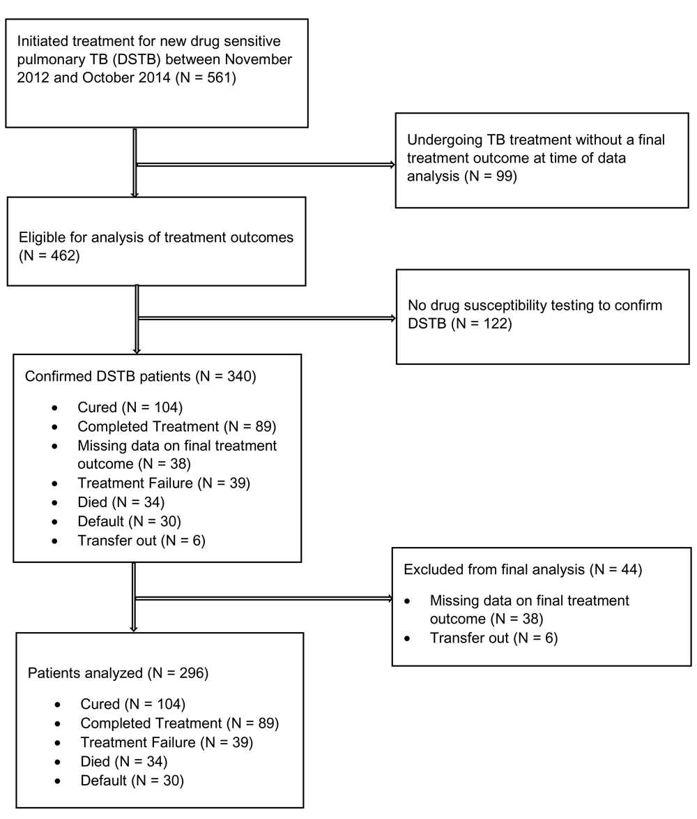 We identified 561 patients treated for new DSTB between November 2012 and October 2014. Among them, we excluded 99 (17.6%) patients who did not yet have a treatment outcome because they were still undergoing TB treatment at the time of analysis (Figure 1). Table 1 lists baseline characteristics of the remaining 462 patients; among them, 122 (26.4%) patients had no drug susceptibility testing performed. 340 patients (73.6%) had a baseline DST to confirm drug sensitive pulmonary TB, and 181 (39.2%) underwent Xpert/Rif testing at baseline. 75 (16.2%) patients tested HIV positive, while HIV status was not recorded for 8 (1.7%) patients. Among the HIV positive patients, 34 (45.3%) were initiated on ART during TB treatment. Median time to ART initiation from TB treatment start date was 43.5 days (IQR 34.0 – 59.5).