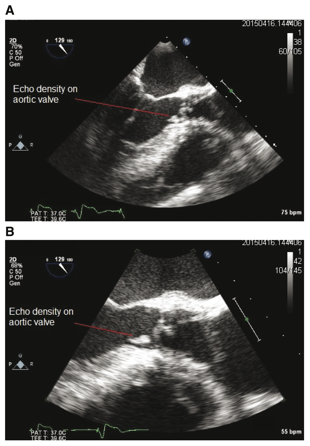 1A: Transesophageal echocardiogram (TEE), mid-esophageal view showing mobile echo density on the prosthetic aortic valve. 1B: Transesophageal echocardiogram (TEE), mid-esophageal view enlarged to show mobile echo density on the prosthetic aortic valve.