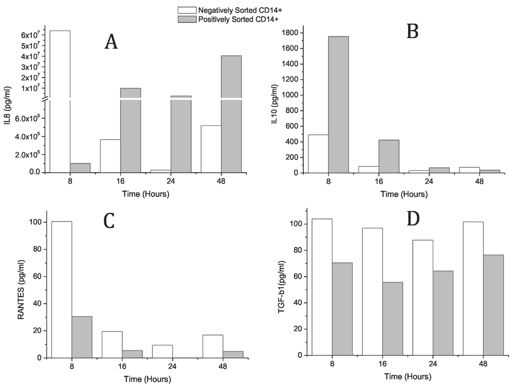 Sorted monocytes incubated with LPS were examined for secretion of various pro- and anti-inflammatory cytokines. The levels of IL-8, IL-10, TGF-β1 and RANTES at different time points after positively and negatively isolated CD14+ monocytes were incubated with LPS were analyzed. The secretion of IL-8 was observed to be at its maximum at 8 hours in negatively sorted monocytes and at 16 hours in positively sorted monocytes (Figure 1A). The IL-8 level in negatively sorted CD14+ cells was 6 times higher than positively sorted CD14+ cells. A similar pattern was observed for secretion of RANTES (Figure 1C) and TGF-β1 (Figure 1D), though the differences were not very pronounced. It was of significance to observe the reversed pattern for an anti-inflammatory cytokine, IL-10 (Figure 1B).