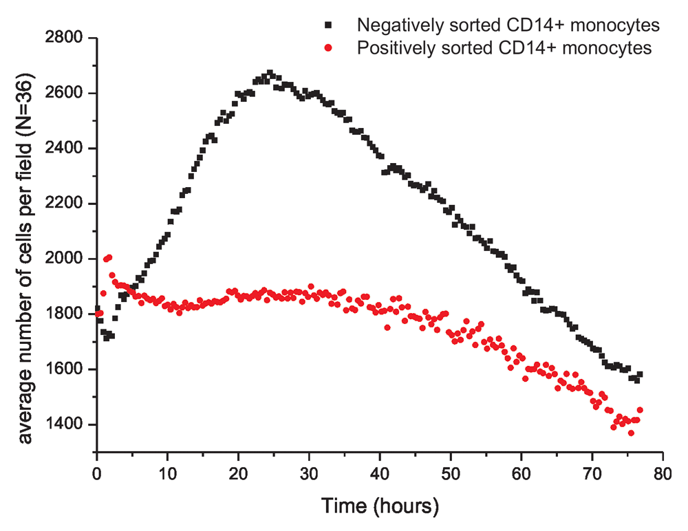 Greater secretion of the pro-inflammatory cytokines in negatively sorted CD14+ monocytes upon activation was observed, during proliferation of activated monocytes. Figure 2 shows the variation in the average number of cells per field (487μm×364μm) for positively and negatively sorted cells. Further, the progression of proliferation is shown in Video V1 for negatively sorted cells and Video V2 for positively sorted cells. Alongside Figure 2, the videos show that negatively sorted cells proliferated rapidly and extensively upon activation, and the maximum number of cells was reached after 16 hours. However, there was no clearly defined time point of maximum number of cells reached by positively sorted cells.