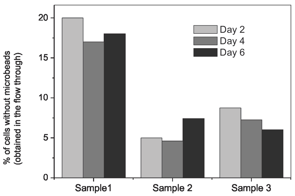 These results show the variation in percentage of cells collected in the ‘flow through’ of column placed in magnetic field. These were the cells from which the microbeads were either degraded or detected and cells were without microbeads. In all the three cultures we examined, the percentage of cells without microbeads was different but there was hardly any change in these percentages when the culture was continued for 6 days. This suggests that in typical culture conditions the Ab-microbeads remain bound with cells for many days.