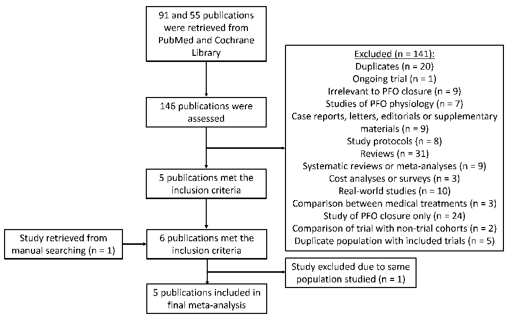 The association between the presence of a patent foramen ovale (PFO) and cryptogenic stroke has been established by previous case-control studies. However, whether PFO closure is effective in reducing stroke events when compared to medical therapy is controversial. Three randomized trials, CLOSURE I1, PC2 and RESPECT3, were conducted. All of these trials showed numerically fewer events in the primary intention-to-treat analysis, but this did not reach statistical significance. Recently, two trials have focused on this issue. Firstly, the CLOSE trial evaluated PFO closure or anticoagulation against antiplatelet therapy, with a primary endpoint of fatal or non-fatal stroke4. Secondly, the REDUCE trial compared PFO closure to antiplatelet therapy only, with a primary endpoint of ischemic stroke, new ischemic stroke or silent brain infarction, demonstrating significant reductions in these events compared to antiplatelet therapy5. Moreover, long-term data of the RESPECT trial were recently published6. Given these new findings, we conducted a systematic review and meta-analysis of these randomized trials to evaluate the benefits and complication rates in PFO closure versus medical therapy.