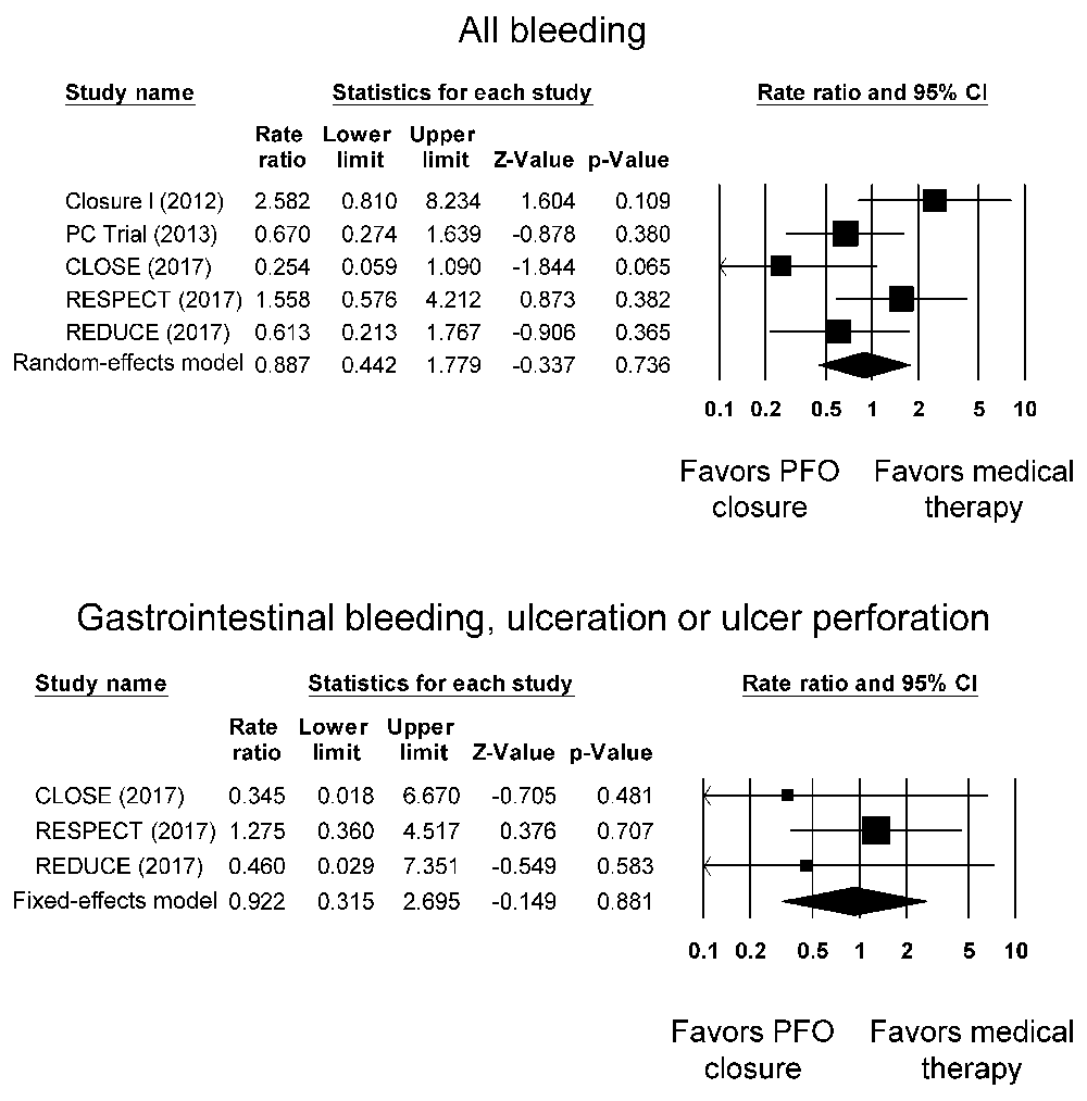 In our meta-analysis of event rates for primary endpoint(s), low levels of heterogeneity were observed, which was probably due to the different definitions used across the trials. For example, two trials, CLOSURE I7 and PC2, included mortality as part of the primary endpoint, whereas the remaining three trials, CLOSE4, RESPECT3 and REDUCE5, included ischemic stroke events but not mortality. The medical therapy offered was similar across the studies, involving anticoagulation, antiplatelet therapy, or both. For the CLOSE trial, the investigators compared antiplatelet therapy with either anticoagulation therapy or PFO closure. For this particular trial, we had pooled data from both anticoagulation and antiplatelet therapy together, and compared the event rates with the PFO closure group. The present meta-analysis also demonstrates the safety of PFO closure when compared to more conservative medical therapy.