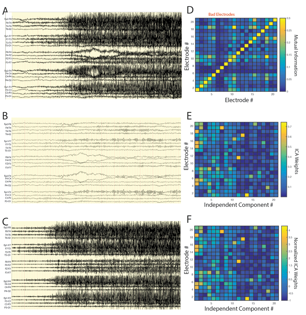 The custom software algorithm involved importing EEG scalp recordings as European Data Format (EDF) files in Matlab 8.4 (Mathworks, Natick, MA). The imported EEG was band pass filtered (16–70 Hz) using a 500th order finite impulse response filter, i.e. FIR1 in referential montage. We then applied a power spectral density algorithm to find extended intervals of elevated high frequency power across electrodes. We next calculated the normalized mutual information (MI)18 adjacency matrix across all scalp electrode contacts during the (16–70 Hz) band-pass filtered artifact epoch of greatest duration and assigned each scalp EEG electrode a single MI value derived from the maximum pairwise MI values in the adjacency matrix. We then determined if this maximum mutual information value exceeded a threshold value, and if that electrode should be included in subsequent artifact reduction processing. If the recording lacked an artifact epoch, or all channels were excluded, artifact reduction was applied to the referential recordings from all recording electrodes.