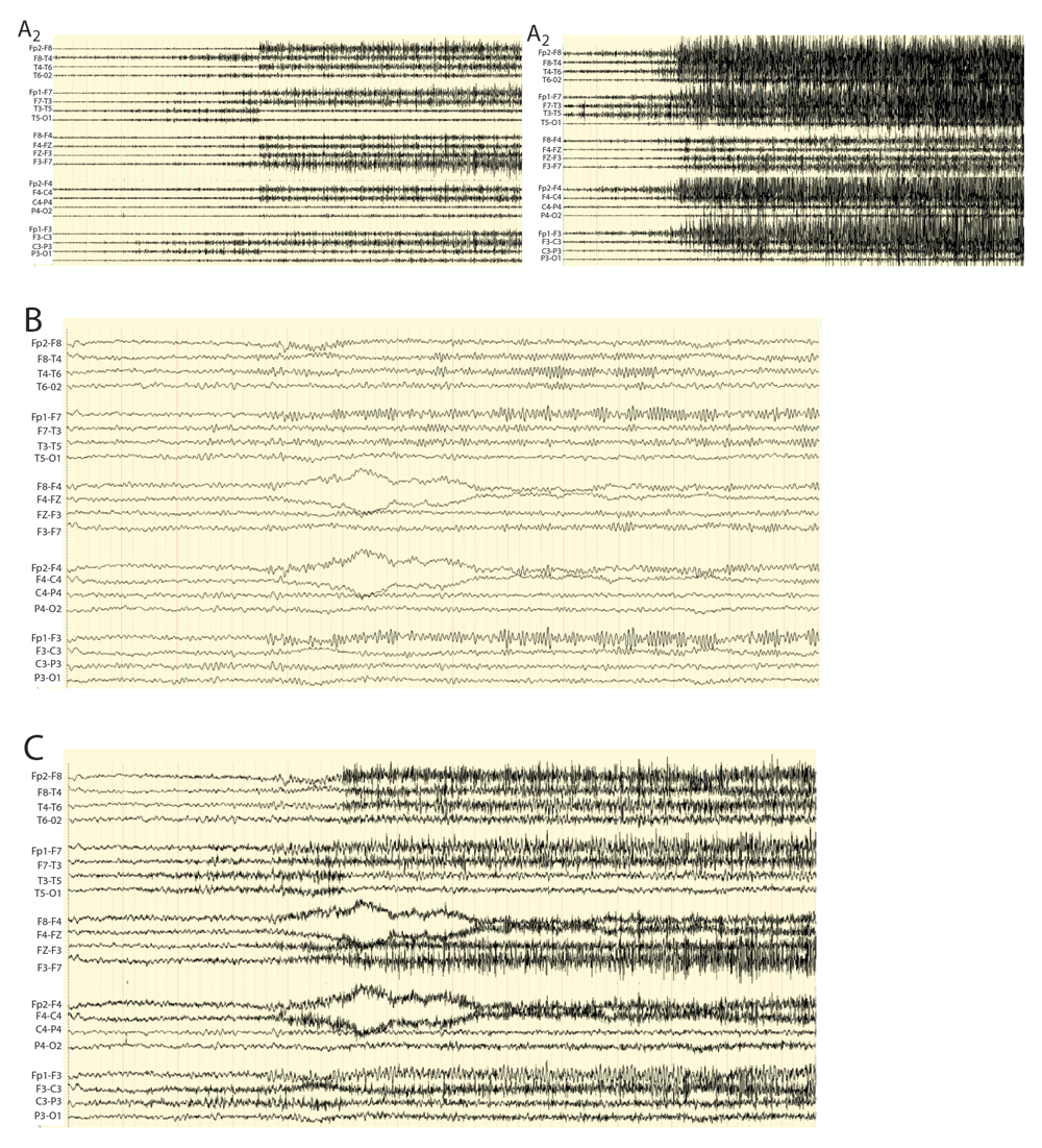 Reconstitution of the low pass (<16 Hz) ictal scalp EEG with the high pass (>16 Hz) neurogenic independent components reveals a clear ictal onset. A. The tentative neurogenic independent components (A1) and myogenic independent components (A2) derived from INFO-MAX ICA processing of the high pass (> 16 Hz) filtered ictal scalp EEG recording. The largest amplitude activity in the neurogenic components are evident frontally and in the left hemisphere. B. The low pass filtered ictal scalp EEG suggests a possible left frontal onset but a convincing ictal rhythm is lacking. C. Reconstitution of the low pass EEG with the neurogenic high pass (> 16 Hz) independent components results in an ictal EEG that demonstrates a more convincing left frontal onset consisting of beta-gamma oscillations with some clear phase reversals in F3 and F7.