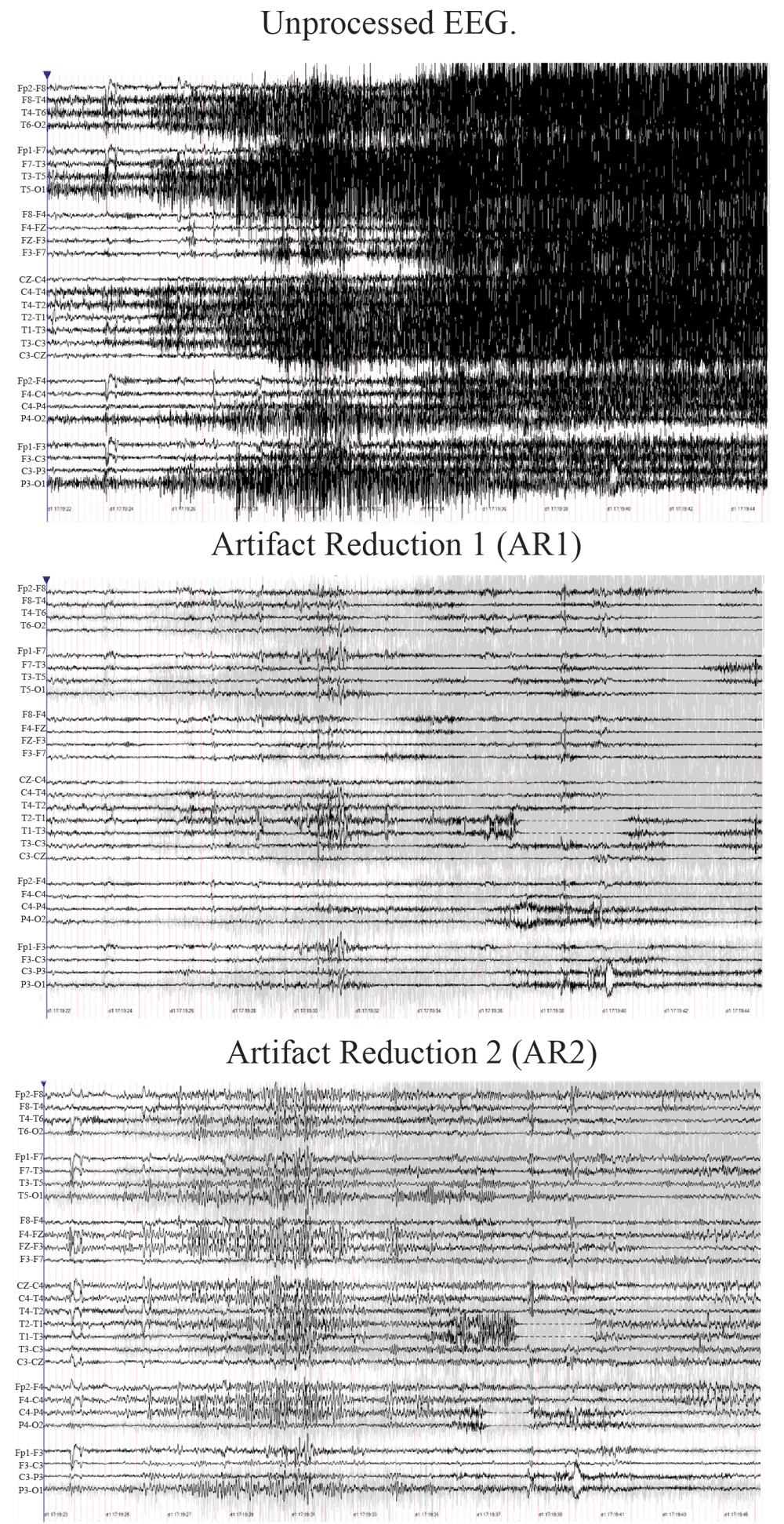 The goal of this study was to assess the validity of a commercially available EEG artifact reduction tool (AR1)17 and compare its validity to a novel automatic artifact reduction tool (AR2), which was developed at the University of California Los Angeles on the basis of inter-reader agreement, confidence, and congruence with other clinical findings, and which we are describing here.