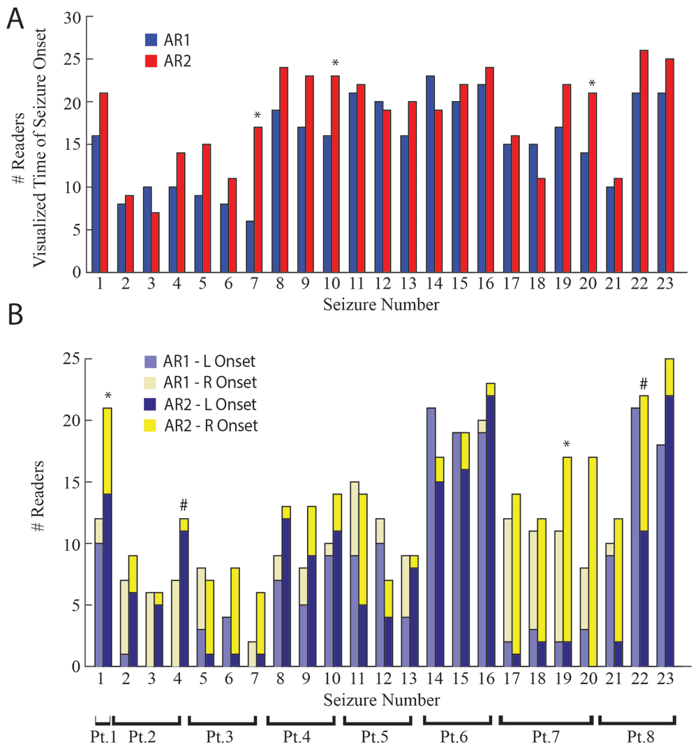 More readers could visualize the time of seizure onset, and assign laterality to seizure onset utilizing AR2 as compared to AR1, and the assigned laterality of seizure onset sometimes differed between the two methods. A. Bar plot of the number of readers whom visualized the time of onset for each seizure utilizing AR1 (blue) or AR2 (red). Across seizures more readers visualized seizure onset utilizing AR2 compared with AR1 (p<0.01). Asterisks indicate statistically significant differences between the two methods in individual seizures (McNemar, p<0.05). B. Stacked bar plot of the number of readers selecting a left- or right-sided seizure onset utilizing AR1 (light blue, left; light yellow, right) or AR2 (dark blue, left; yellow, right). Across seizures more readers lateralized seizure onset utilizing AR2 compared with AR1 (p<0.01). Asterisks indicate statistically significant differences in individual seizures (McNemar, p<0.05), number sign indicates a significant change in the determination of laterality utilizing AR2 compared to AR1 (McNemar, p<0.05).