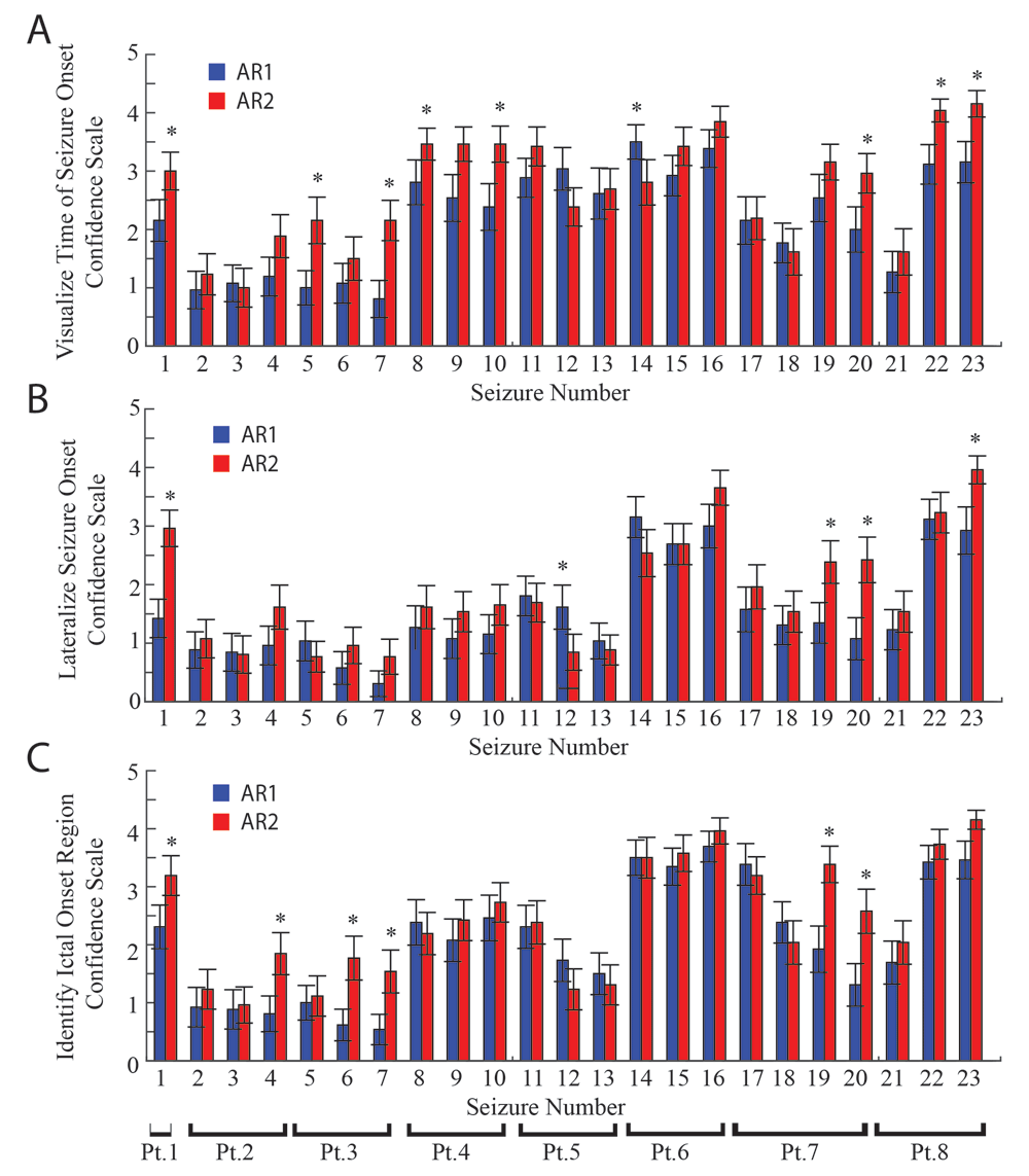 A. Bar plot of the mean confidence scale values for visualizing the time of seizure onset for the 23 seizures interpreted utilizing AR1 (blue), and AR2 (red). Across seizures, confidence scale values were greater when AR2 was utilized as compared with AR1 (p<0.01). Asterisks indicate differences in confidence values in individual seizures (p<0.05). Error bars are calculated as s.e.m. B. The respective mean confidence scale values for seizure onset lateralization. C. The respective mean confidence scale values for seizure focus localization. Across seizures, confidence scale values for lateralizing seizure onset, and identifying the seizure focus were greater when AR2 was utilized as compared with AR1 (p<0.05).