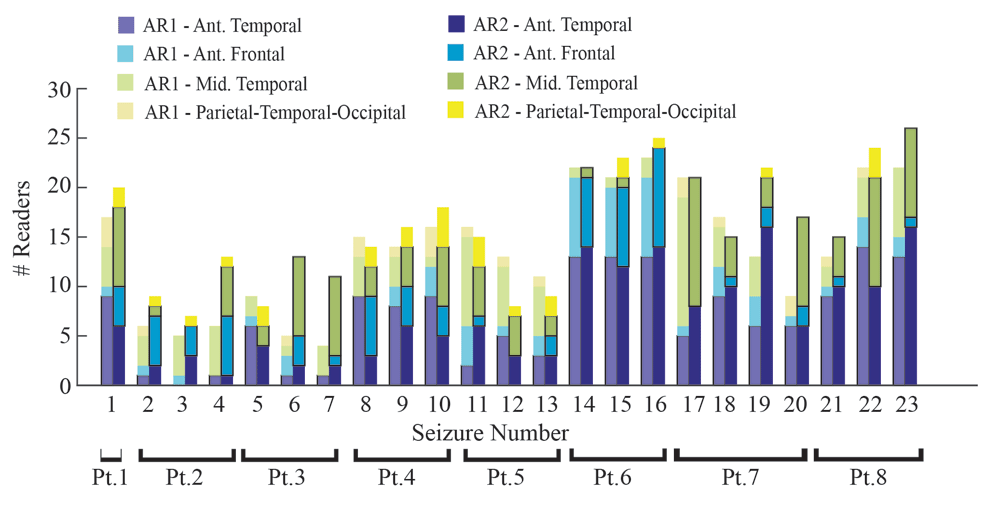 Stacked bar plot of the ictal onset region assignments using either AR1 (lighter colors) or AR2 (darker colors) for all 23 seizures. Overall, across seizures, more readers were able to render an assignment using AR2 as compared to AR1 (p<0.05). Inter-reader agreement using for assigning the ictal onset region was marginal using either AR1 or AR2.
