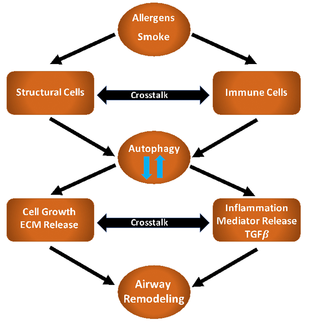 An altered autophagy pathway is seen in response to cellular stress in asthma and chronic obstructive pulmonary disease (allergens or smoke), leading to activation and crosstalk between structural airway and immune cells. This further leads to impairment of autophagy causing degradation of intracellular constituents, providing an energy resource for ECM protein biosynthesis, and releasing mediators of inflammation and profibrotic signaling, which collectively lead to airway remodeling in the lung. ECM: extracellular matrix; TGFβ: transforming growth factor-beta.