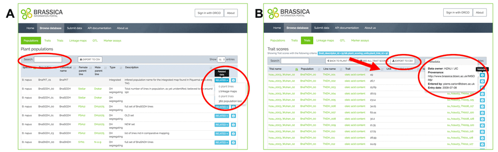 Given the importance of Brassica species worldwide, integrated approaches to research and plant breeding for crop improvement are required to address future challenges, such as satisfying increased demand for higher quality or producing reliable yields in a more variable environment with sustainable, lower input cultivation systems. Researchers have quantified many aspects of Brassica phenotypic diversity, including the content of industrially important compounds, yield in response to fertiliser input or degree of resilience to fungal pathogens and pests, such as flea beetles, to aid in crop improvement. The ability to host such data generated from these experiments in an open and accessible database promotes the comparison of trait measurements and calculation of genotype-phenotype (G X E) associations across multiple studies in meta-analyses, potentially identifying underlying common mechanisms or previously unrecorded correlations. This is especially important for plant breeders and researchers involved in pre-breeding, leading to generation of new crop varieties. For example, meta-analysis across different populations or environments can help confirm the location of key areas of the genome identified from multiple studies or assist and help avoid potential trait trade-offs of beneficial or deleterious alleles due to linkage drag. The ability to associate phenotypic data with genomic regions, DNA markers, and genome and transcribed sequence provides the potential to expedite the integration of favorable alleles via marker-assisted or genomic selection. However, few plant phenotype databases exist, despite the importance of phenotypic data to render meaning to sequence data.