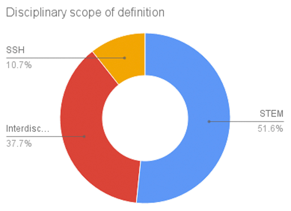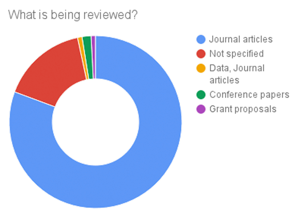 The number of definitions of OPR over time show a clear upward trend, with the most definitions in a single year coming in 2015. The distribution shows that except for some outlying definitions in the early 1980s, the phrase “open peer review” did not really enter academic discussion until the early 1990s. At that time, the phrase seems to have been used largely to refer to non-blinded review (i.e. open identities). We then see a big upswing from the early-mid 2000s onwards, which perhaps correlates with the rise of the rise of the openness agenda (especially open access, but also open data and open science more generally) over that period (Figure 1). Most of the definitions, 77.9% (n=95), come from peer-reviewed journal articles, with the second largest sources being books and blog posts. Other sources include letters to journals, news items, community reports and glossaries (Figure 2). As shown in Figure 3, the majority of definitions (51.6%) were identified to be primarily concerned with peer-review of STEM-subject material, while 10.7% targeted material from Social Sciences and Humanities material. The remainder (37.7%) were interdisciplinary. Meanwhile, regarding the target of the OPR mentioned in these articles (Figure 4), most were referring to peer review of journal articles (80.7%), with 16% not specifying a target (16%), and a small number of articles also referring to review of data, conference papers and grant proposals.