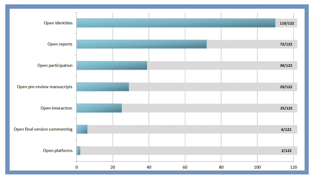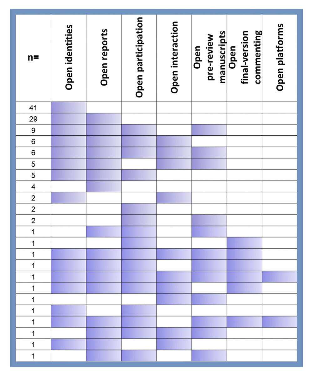 Within just these two examples, there are already a multitude of factors at play, including the removal of anonymity, the publishing of review reports, interaction between participants, crowdsourcing of reviews, and making manuscripts public pre-review, amongst others. But each of these are distinct factors, presenting separate strategies for openness and targeting differing problems. For example, disclosure of identities aims usually at increasing accountability and minimizing bias, c.f. “referees should be more highly motivated to do a competent and fair review if they may have to defend their views to the authors and if they will be identified with the published papers” (Armstrong, 1982). Publication of reports, on the other hand, also tackles problems of incentive (reviewers can get credit for their work) and wastefulness (reports can be consulted by readers). Moreover, these factors need not necessarily be linked, which is to say that they can be employed separately: identities can be disclosed without reports being published, and reports published with reviewer names withheld, for example.