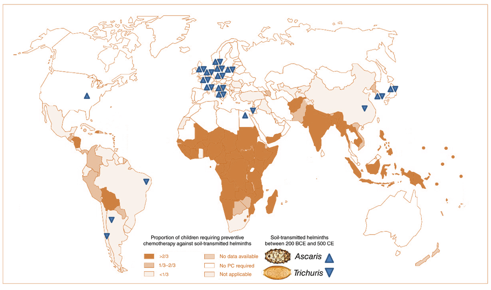 Background map implemented with palaeoparasitological records of roundworms (Ascaris) and whipworms (Trichuris) recovered from a global selection of archaeological sites built between 200 BCE and 500 CE (Common Era)2,4–6,9,10. The background map has been adapted from World Health Organization, program on Control of Neglected Tropical Diseases (gamapserver.who.int/mapLibrary/Files/Maps/STH_2011_global.png).