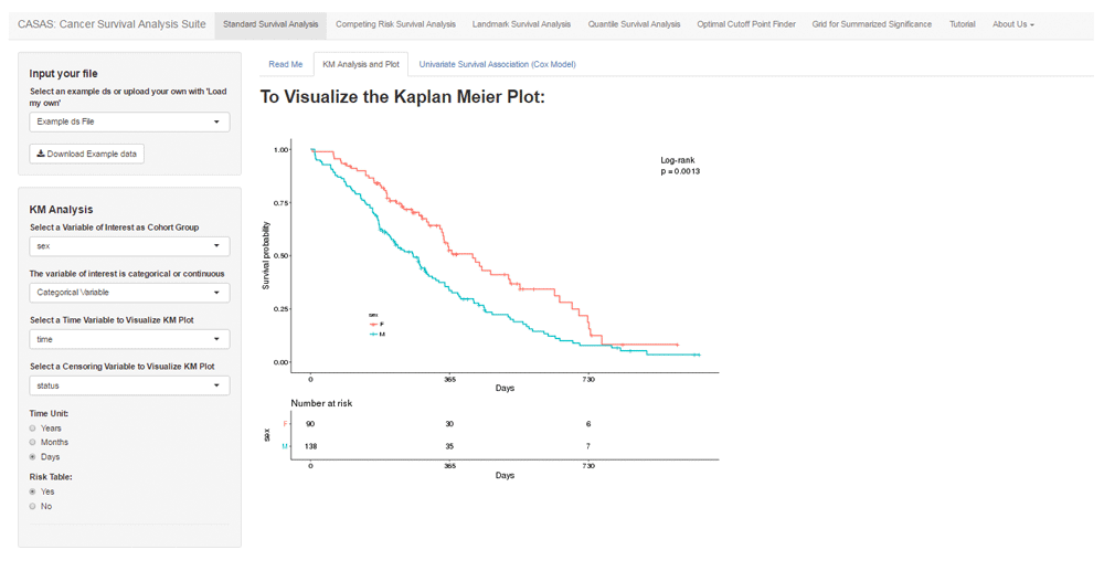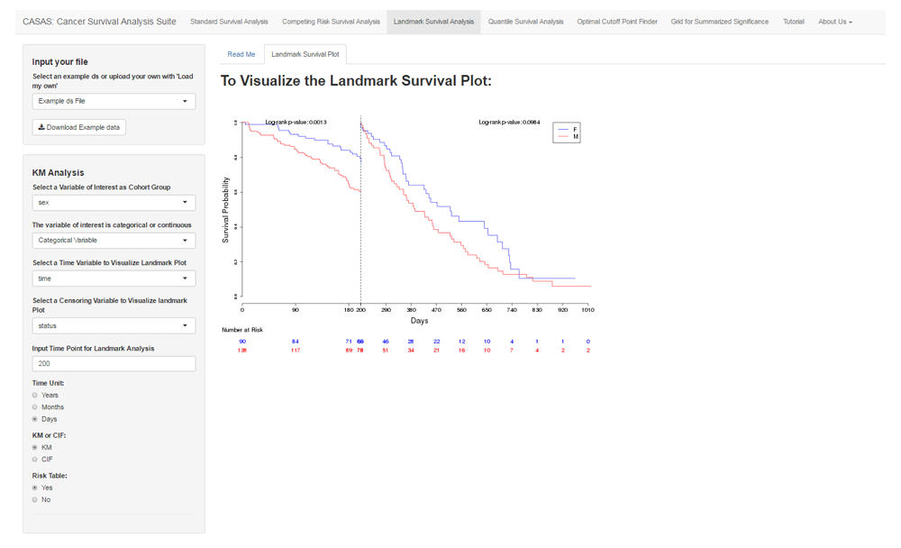 The CASAS web tool (http://shinygispa.winship.emory.edu/CASAS/) includes preprocessed example data under each tab. The user could use the example data or could upload a dataset of their choice in the same format as the example data. For Kaplan Meier survival analysis and Landmark analysis, NCCTG Lung Cancer data from 228 patients as available in the survival package is used5. The data can be accessed in R using data(lung). For quantile survival analysis, Level 3 RNASeqV2 Breast Cancer (BRCA) data was downloaded from the TCGA data portal4. 553 patients that received radiotherapy and had survival information were used. Gene expression data for a specific biomarker gene was log2 transformed. The user has the choice to divide the data based on either the twenty-fifth percentile (set as default) or the fiftieth or the seventy-fifth, or an optimal cut point based on the martingale residuals. Similarly, for competing risk analysis, the user could choose the example data or upload their own. The example data consists of 35 patients with acute leukemia who underwent Hematopoietic stem cell transplantation (HSCT) affected by either AML or ALL8 (http://www.stat.unipg.it/luca/R).