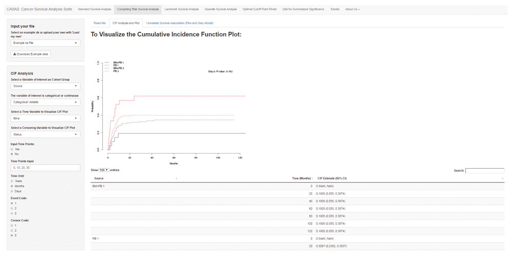 The CASAS software is written in R and tested using version 3.3.0. The Interactive KM, CIF plots and data tables are made visible through a web browser using the shiny R package (www.rstudio.com/shiny).