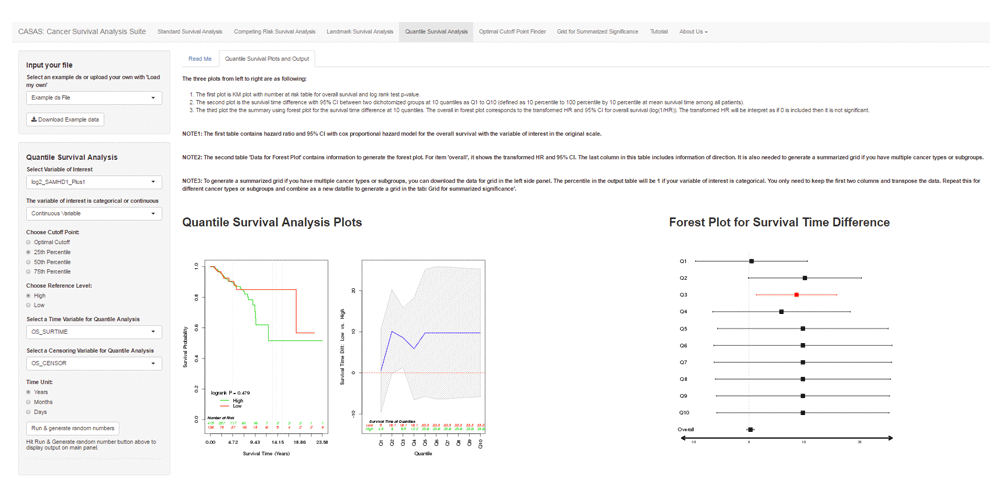 In summary, CASAS suite of tools is a one-stop shop for conducting survival analysis without requiring any prior programming knowledge. It is a web-based application that, as a single tool, can carry out KM plot, univariate HR, landmark analysis, quantile survival analysis and competing risk analysis. It allows a user to combine results from various studies or cancer types as well.