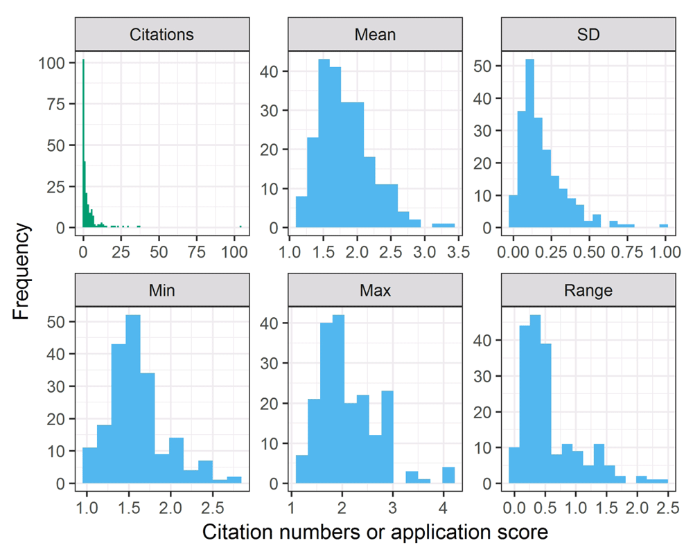 The histograms in Figure 1 show the distributions of total relative citations and the application score statistics: mean, standard deviation, minimum, maximum and range (maximum minus minimum). There was a strong positive skew in citations with one outlying relative citation of 104; the next largest citation was 34. To counter this positive skew we used a base e log transform in later analyses. There was also a positive skew in the score standard deviation and range, and we also log-transform these predictors.