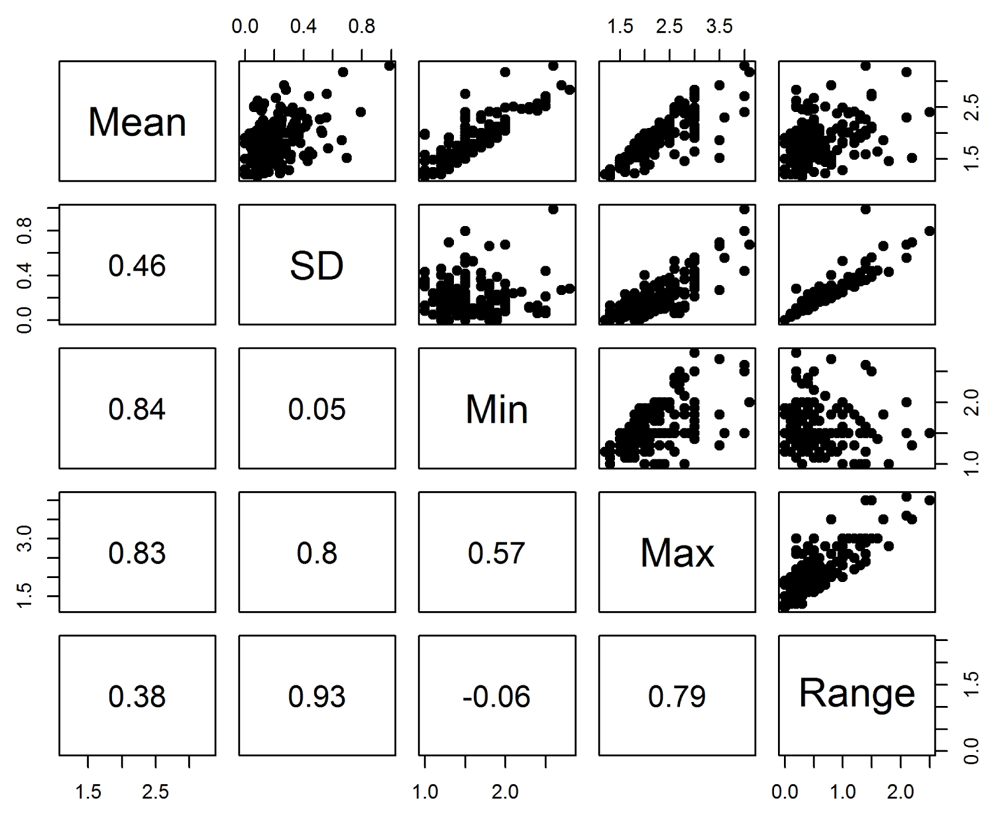 The scatter-plots in Figure 2 show the associations between the application score statistics. There was a strong correlation between the standard deviation and maximum (0.80), but not between the standard deviation and minimum (0.05). This indicates the largest disagreement is where at least one panel member has given a poor score (remembering lower scores are better). Applications where there was one dissenting panel member with a good score were unlikely to be funded as their mean score would not be competitive, and hence are not in this sample. There was a strong positive correlation between the two measures of panel disagreement, the standard deviation and range (0.93).