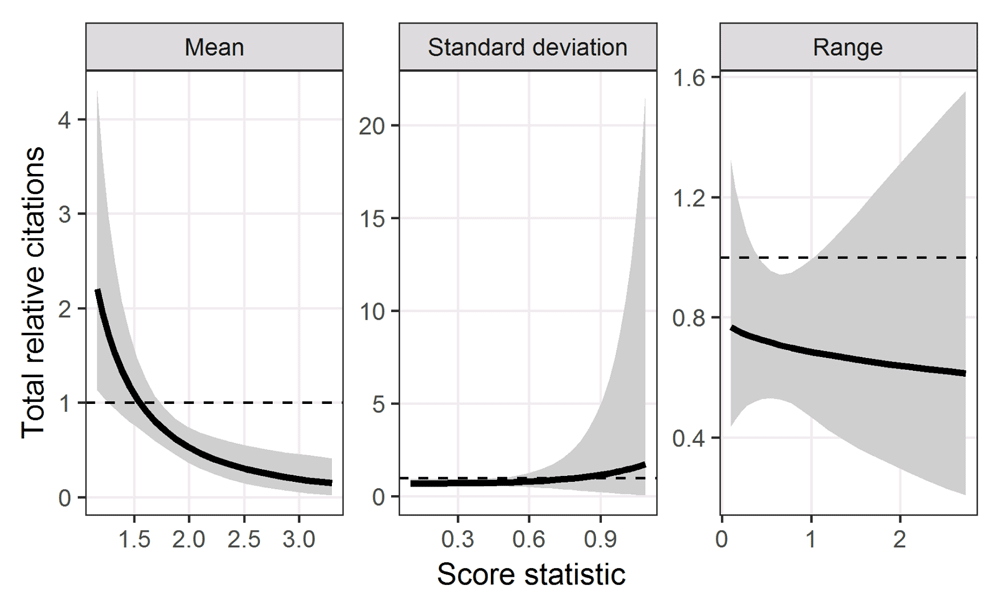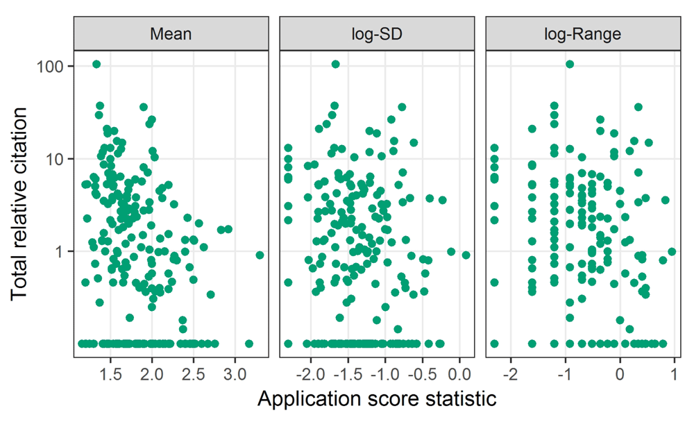 The scatter-plots in Figure 3 show the association between total relative citations and the score statistics. We used the log-transformed citations and the standard deviation and range to remove the skew and so show a clearer association. The variance in log-citations appears relatively stable over the score statistics, somewhat confirming the validity of log-transforming the citations27. The points along the bottom of the y-axis are the 74 applications (33%) with no citations. Some association between mean score and citations is visible, with a generally downward pattern in citations for increasing score. There is no clear association between citations and either the standard deviation or range.