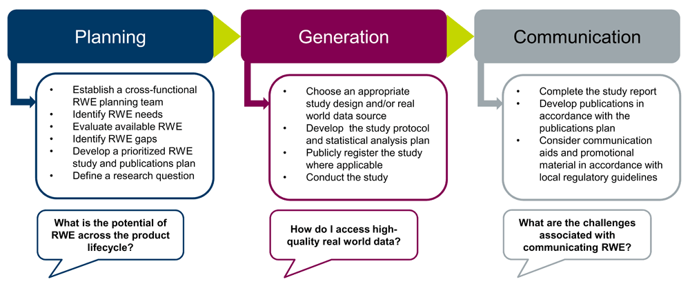 This perspectives paper is aimed primarily at an industry audience with an interest in forming or expanding an RWE function, and looks to describe the planning, generation and communication of RWE (Figure 1), specifically: