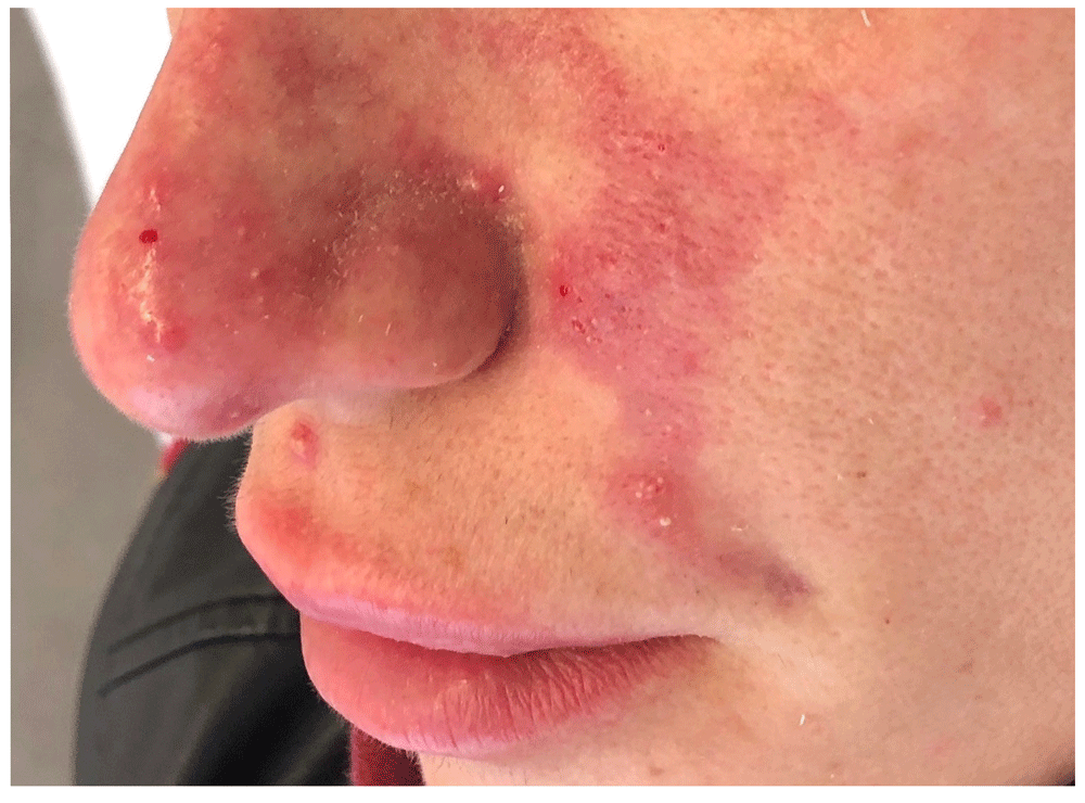 Three days after dermal filler treatment, erythematous and blister formation was observed along the nasolabial vessels. Part of the erythema extends to the middle of the nose.