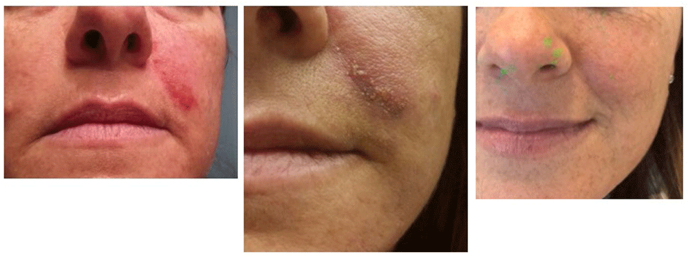 Left panel: 7 days after first treatment; middle panel: after 15 days; right panel: clinical check after 45 days. It should be noted that there is no scarring in the final image.