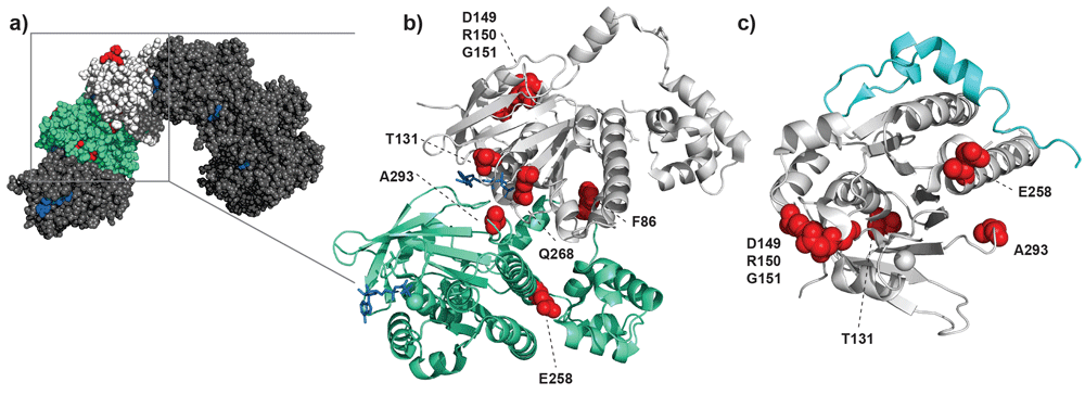 Overview of RAD51 mutations mapped onto structures based on PDB ID 5NWL13 and 1N0W29. (a) Model based on the crystal structure of a heptameric right-handed RAD51 nucleoprotein filament. Two adjacent protomers are colored green and light gray; the other five protomers are shown in darker gray. ATP is highlighted by the blue areas at the interfaces of distinct protomers, and sites of mutation are highlighted in red. The red patch on the top of the white-colored protomer is the patch of amino acids 149–151 that is assumed to affect interaction of RAD51 with other binding partners. Note that Q272 is not highlighted in the figure, as that residue was not resolved in the crystal structure. (b) Focus on the interface between two protomers, where ATP is shown in blue and the discussed sites of mutation are highlighted with red spheres. Most of these mutations can be found at the direct interface between the two protomers and thus close to the nucleotide-binding pocket. (c) Interaction of RAD51 (light gray) with a BRCA2 BRC repeat (cyan). The locations of mutation discussed are highlighted in red. Here, one mutation is in close proximity of the binding region with the BRC repeat (E258) and therefore might impair RAD51 binding by BRCA2.