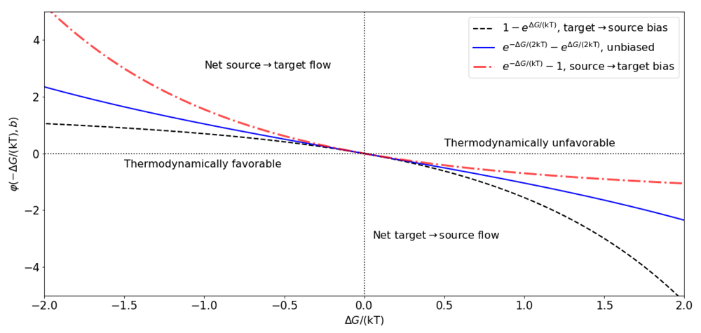 Rectification can be described by Equation (11) by setting b to values different from 1/2, and becomes more pronounced as b is closer to either 0 or 1. These values represent biases in the transport toward the source, or the target compartment, respectively. As a consequence, rectification yields an asymmetry in the graph of α − β as a function of ∆G (Figure 1). For electrogenic transport, rectification can be thought of as an asymmetric relationship between current flow and voltage, with respect to the reversal potential vo. The particular case b = 1/2 (non rectifying) yields a functional form for current similar to that proposed by Pickard (1969), and later reproduced by (Endresen et al., 2000), namely
