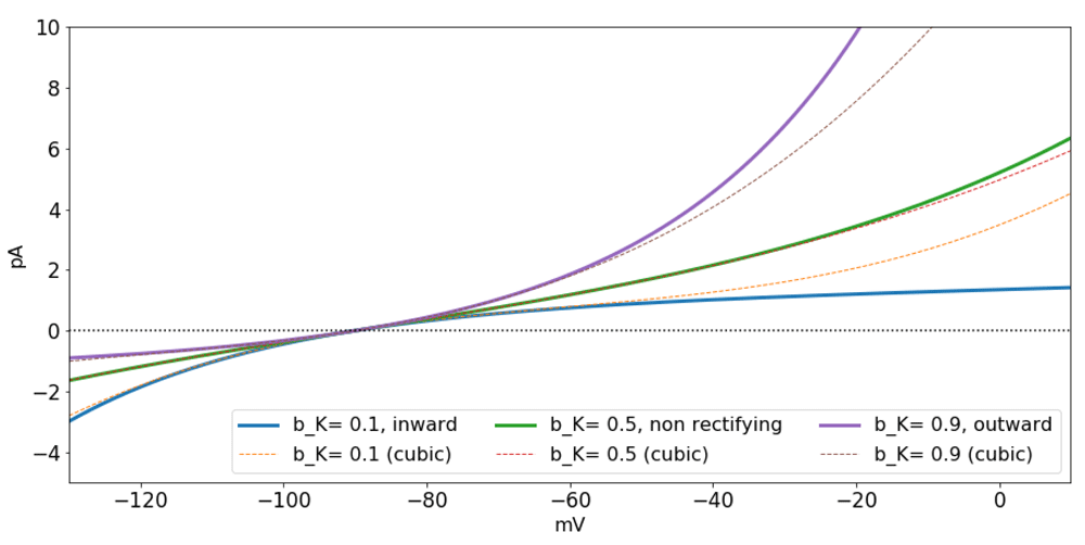 Current flow through inward rectifier channels (Riedelsberger et al., 2015) can be fit to values of bK < 1/2. For instance,