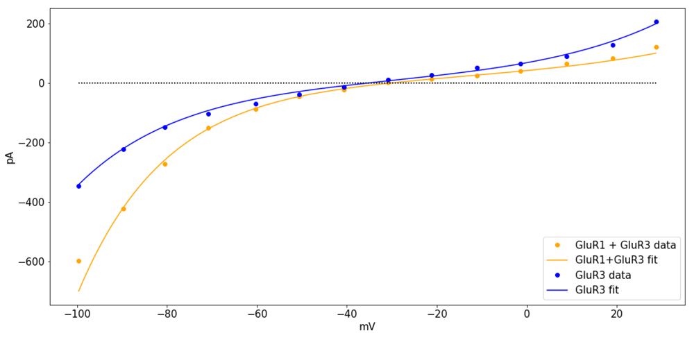 Currents were recorded from oocytes injected with GluR3 cRNA (blue), or a combination of GluR1 and GluR3 cRNA (orange), in Ca2+ ringer solution after activation by AMPA. The curves were fit with(vo, b, rq) = (−30, 0.45, 21), for GluR3 and (vo, b, rq) = (−35, 0.35, 20), for GluR1+GluR3. The data was digitized from Figure 3B in the article by Hollmann et al. (1991), using the ginput function from the python module matplotlib (Hunter, 2007) see Supplementary File 2.