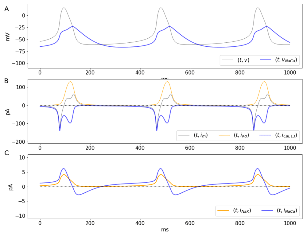 A. Transmembrane potential (gray) and the reversal potential vNaCa (blue) as a function of time. B. Dynamics of large calcium (blue) and potassium (orange) currents in pA. The total current shown by a gray line labeled as im. C. Currents mediated by NaK ATPases (orange) and Na-Ca exchangers (blue), respectively. Notice the carrier mediated currents (C) are about one order of magnitude smaller than those mediated by channels shown (B).