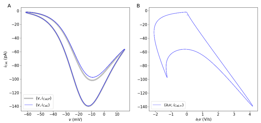 A. Behavior of the inactivating L-type Ca2+ current with respect to the transmembrane potential (blue line) and a non-inactivating current (gray line). Notice that two points with locally maximum current amplitude occur during the action potential. The local minimum with larger current values occurs during the upstroke of the action potential. The local minimum with smaller current values occurs during the downstroke of the action potentials. (B) Calcium currents as a function of the time-dependent change in v. The maximum rate of change for v occurs when the calcium current reaches its maximum amplitude.