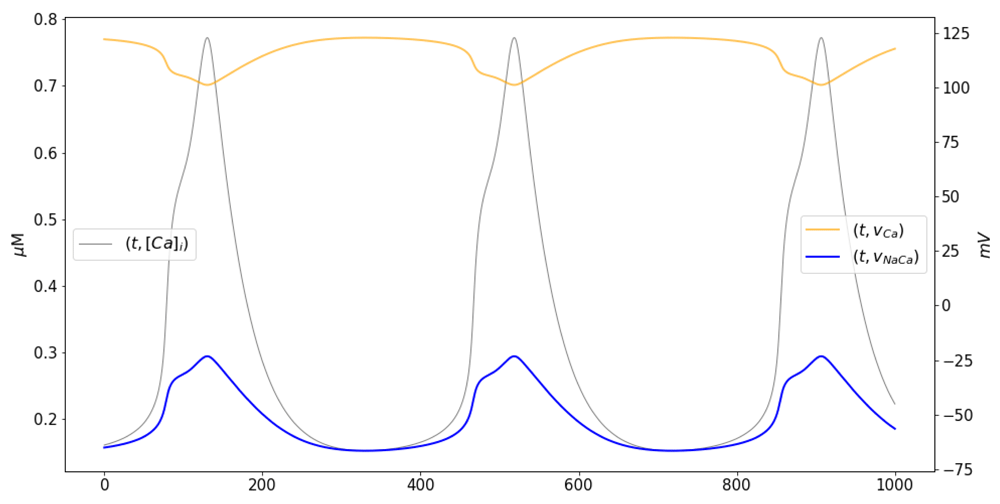 Time courses of the intracellular calcium concentration (gray, left axis), the Nernst potential for Ca2+ (orange, right axis), and the reversal potential for the Na-Ca exchanger (blue, right axis). Notice the two phases of calcium increase that occur in agreement with the double peak observed in the calcium current (see Figure 4B, blue trace).