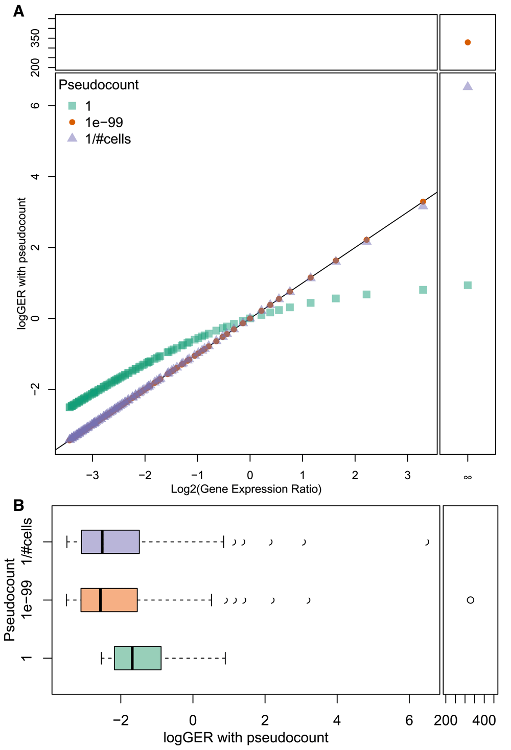 Prior to differential expression testing, expression ratios between genes from two cell types are calculated and reported in log base 2 (logGER, log gene expression ratio). Expression ratio calculations are one method used to filter the gene list prior to differential expression testing, thereby removing some of the multiple testing burden for the Wilcoxon test step. Given that scRNAseq gene expression data is expected to be sparse, and that some clusters may not contain any cells in which a certain gene was detected, it is necessary to add a pseudocount to the logGER calculations to prevent divide-by-zero errors and the resulting +/- Inf values. As exemplified in Figure 1, the choice of pseudocount impacts logGER results. A pseudocount of 1 is commonly used but tends to compress the magnitude of the ratio (Figure 1a). However, this does result in comparisons to zero being near the range of other logGER values. Using a small pseudocount such as 10-99, on the other hand, results in logGER values being very close to their true value, rather than suffering from the compression caused by the integer pseudocount. The only problem with this is that comparisons with zero result in very high magnitude logGER values, well outside the range of the rest of the results (Figure 1b). If zero counts of a transcript in a cell library truly represented that gene not being expressed at all in that cell (i.e. if high-throughput single-cell RNAseq experiments were exquisitely sensitive), then this wouldn’t be a problem, since the true expression ratio would be infinitely large. However, zero counts are better interpreted to mean that transcripts for the gene in question were not detected in that cell. Given the relatively poor sensitivity of current high-throughput scRNAseq technology on a per cell basis, this does not necessarily mean that the gene was not expressed. Thus, it would be better if logGER values for comparisons with zero were reasonably close in magnitude to the rest of the results. To accomplish this, we use a pseudocount representing the smallest possible “step” in the count-based data, set to the inverse of the number of cells in the data. This is sufficiently small as to not compress logGER magnitudes, while keeping comparisons with zero reasonably close to the range of potential logGER values.