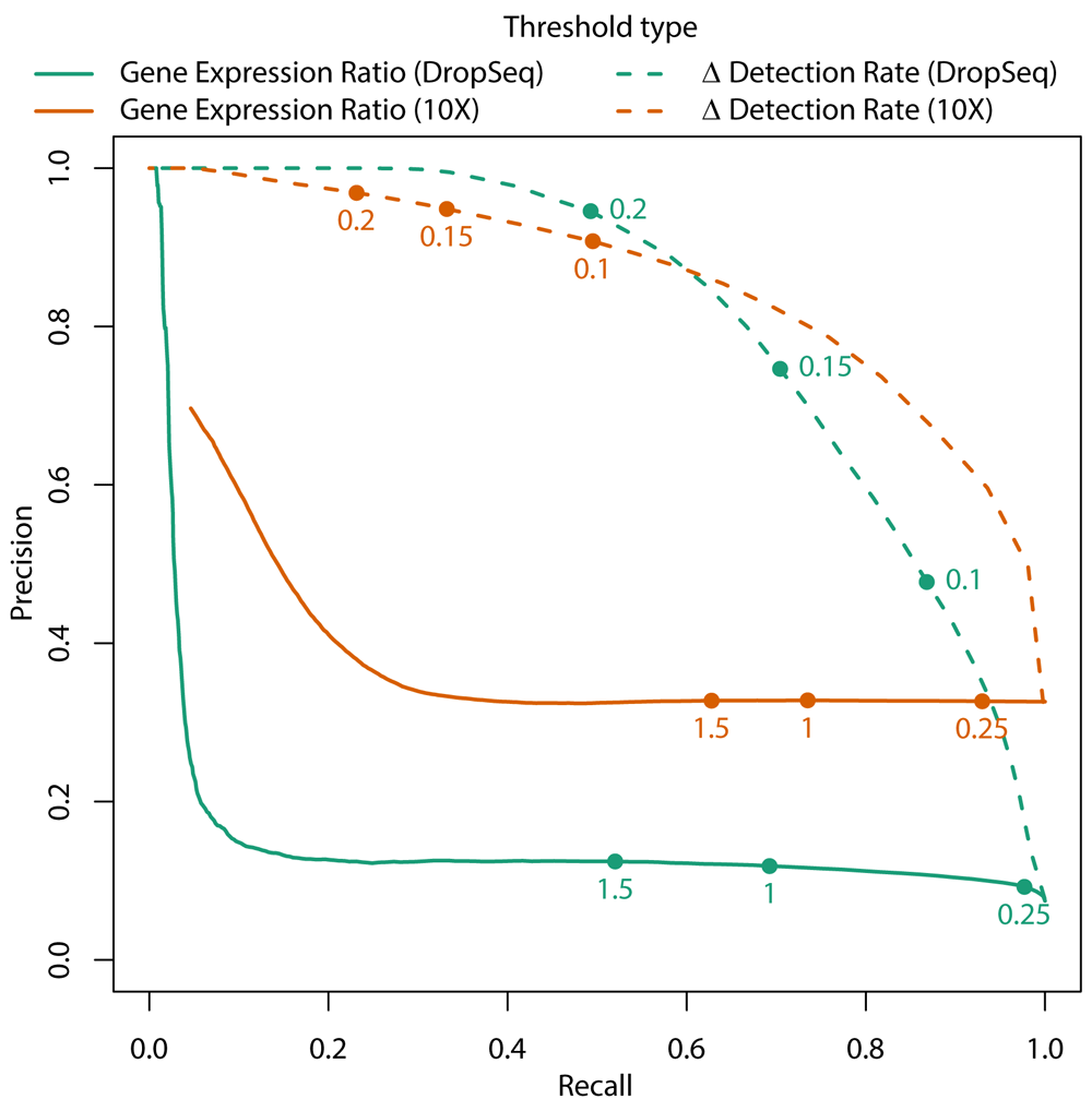 Using DropSeq data from embryonic day 13.5 from mouse cerebral cortex (green) and 10X Genomics Chromium data from the human liver (orange), a Wilcoxon rank-sum test was used to test the differences in gene expression for all genes between every pair of clusters. P-values less than or equal to 0.01 were considered significant. Difference in detection rate (dDR – dashed line) and gene expression ratio (logGER – solid line) were calculated for all genes between pairs of clusters, and the ability to predict significance differences in gene expression at different thresholds of logGER or dDR were used to generate precision-recall curves. Highlighted are potential thresholds for dDR or logGER.
