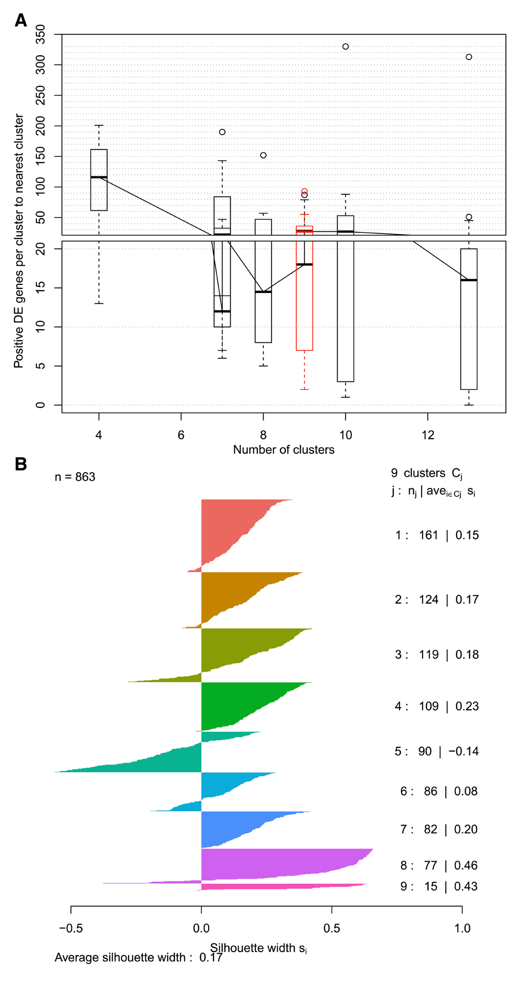 A. Boxplots representing number of differentially expressed genes between neighbouring clusters for each cluster resolution. For each cluster at a specific resolution, the number of positively differentially expressed genes to its nearest neighbouring cluster is counted, and those counts are represented as a boxplot. The boxplots are arranged along the x-axis to reflect the number of clusters found at that resolution. Highlighted in red is the cluster resolution currently selected in the interface. A similar figure is also available for number of marker genes per cluster. B. Silhouette plot for the selected cluster resolution. A horizontal bar plot where each bar is a cell, grouped by cluster. Silhouette width represents the difference between mean distance to other cells within the cluster and mean distance to cells in the neighbouring cluster. Distance is Euclidean in reduced dimensional (generally PCA) space. Positive values indicate that the cell is closer to cells within its cluster.