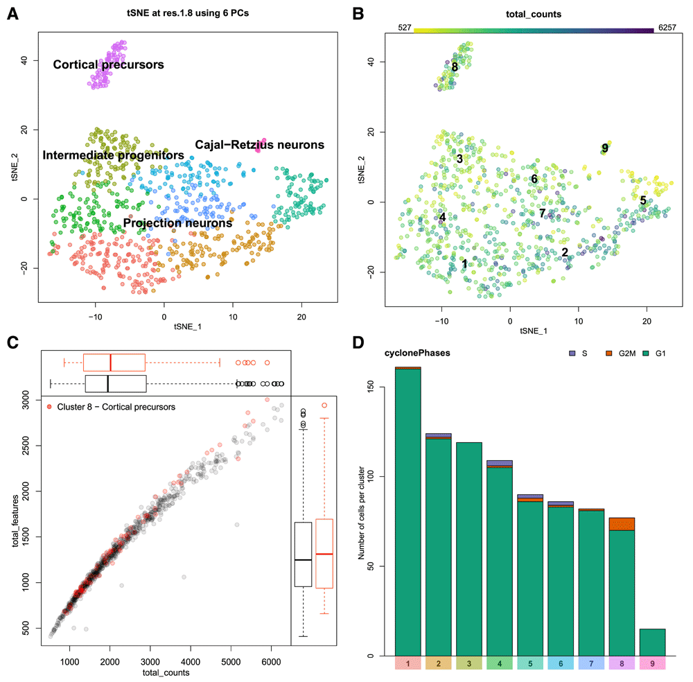 A. A 2D projection of cells in gene expression space (frequently a tSNE plot) is coloured by cluster. Clusters can be labelled by number, or automatically annotated as seen here. B. An example of a metadata overlay on the cell projection. The library size (number of transcripts detected) per cell is represented by colour scale, where darker cells have larger library sizes. C. Metadata can be represented as a scatter plot. The relationship between gene detection rate (number of unique genes detected – y-axis) and library size (x-axis) is shown here. The cells from the selected cluster (cluster 8, cortical precursors) are highlighted in red. D. Categorical metadata is represented as a stacked bar plot showing the number of cells contributing to each category per cluster. This plot shows predicted cell cycle state, with G1 phase in green, G2/M in orange, and S phase in purple.