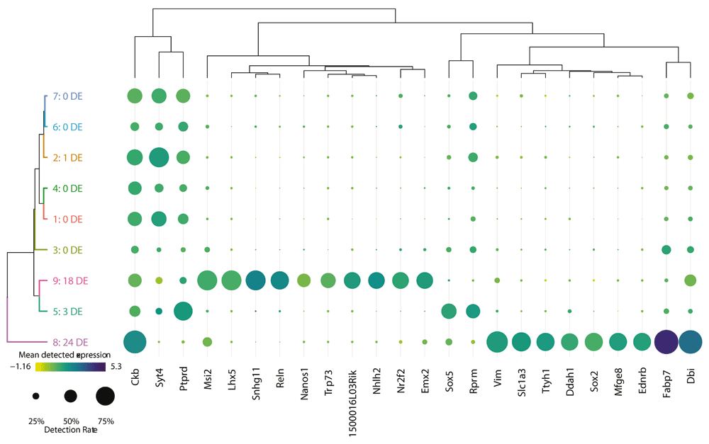 Once the user is satisfied that their cluster solution is appropriate and unaffected by technical factors, the next step in data interpretation is to determine the cellular identity of each cluster by its gene expression. The three different differential expression tests done prior to running the visualization assist with this by highlighting the most informative genes in the dataset. In a sufficiently heterogeneous dataset, differential expression between a cluster and the rest of the data can be useful for identifying genes that uniquely define a cluster’s cellular identity. A more conservative form of this is the identification of marker genes – those genes that are significantly positively differentially expressed in all pairwise tests between a cluster and all other clusters. This highlights genes expected to be found at a significantly higher expression in this cluster than anywhere else in the data. Finally, there is the testing between each cluster and its nearest neighbour to highlight local differences in expression. Each of these sets of differentially expressed genes can be presented as a dot plot comparing clusters, as seen in Figure 5. A dot plot is a modified heatmap where each dot encodes both detection rate (by dot diameter) and average gene expression in detected cells (by dot colour) for a gene in a cluster. Here up to the top ten marker genes per cluster are shown, but both the type of differential expression test used to generate the gene set and the number of differentially expressed genes contributed per cluster can be adjusted using the interactive interface. At this point in the analysis, it is also possible to download any of these differential gene expression results as tab-separated value files for further analysis, by selecting the cluster of interest and differential expression type and clicking “Download gene list”. This may be of value if the user is using this platform to share the data online, or with those who would prefer not to use R for further analysis. In this dot plot, we can see the top 10 marker genes for our putatively quiescent cortical precursor cell population (cluster 8) include known marker genes for cortical radial precursors (Fabp7, Slc1a3, Vim, and Sox2), a known marker for adult neural stem cells (Dbi), as well as novel marker genes for this population (Mfge8, Ttyh1, Ddah1, and Ednrb) (Yuzwa et al., 2017). The dot plot format also shows us that while Ckb is significantly positively differentially expressed in cluster 8 relative to all other clusters, it is still quite highly expressed in all cells in the data, and thus would not be an optimal marker gene.
