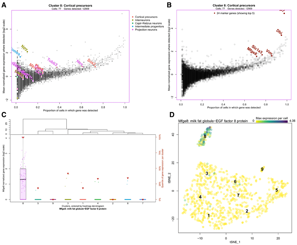 A. A scatter plot representing gene expression in the highlighted cluster, the cortical precursor cluster 8. The x-axis represents the proportion of cells from that cluster in which a gene is detected (more than zero transcript counts), and the y-axis is the mean normalized transcript count from cells in which the gene was detected. The cell type marker genes are highlighted, indicating that this cluster was classified as cortical precursors based on the high relative expression of both Sox2 and Pax6, as well as Nes and Cux1 (markers for both cortical precursors and projection neurons). B. The same scatter plot is shown with the top 10 marker genes for cluster 8 highlighted, though the user can choose other differentially expressed gene sets from the heatmap, or search for genes of interest using the interface. The identity of any point can be determined by clicking on it in the interface. C. Boxplots comparing the expression of a gene of interest across all clusters. Clusters are arranged on the x-axis based on the cluster dendrogram generated for the dot plot above (Figure 5), and normalized transcript count for the gene of interest (Mfge8, in this case) is represented on the y-axis. The dots on each boxplot represent the individual data points, gene expression per cell. The red triangles indicate the rank of relative gene expression in that cluster, as indicated on the y-axis on the right side. This figure shows that Mfge8 may be a marker of cortical precursors. D. Gene expression overlaid on the cell projection. Gene expression is represented by a colour scale on the cells of the two-dimensional projection, where darker indicates higher expression. If multiple genes are selected, the maximum gene expression value per cell is shown. Clusters can be labelled by number or annotation. This figure shows the distribution of Mfge8 expression in the dataset.
