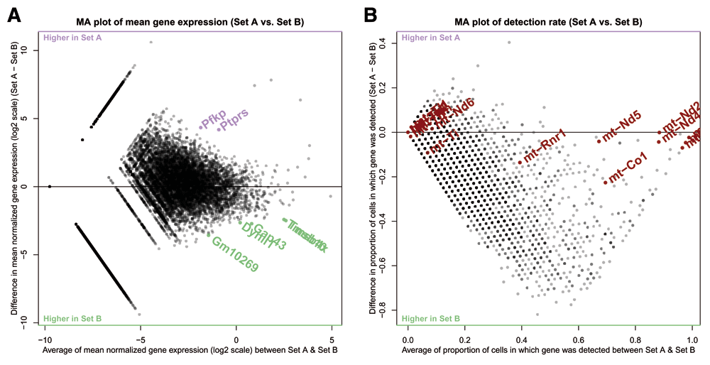 A. An MA plot showing log-ratio of gene expression between cell sets on the y-axis, and average gene expression across sets on the x-axis. Set A here is a subset of cluster 5 with low library sizes, while set B is the subset of cluster 5 with high library sizes. Highlighted are the top differentially expressed genes upregulated in set A over set B (purple) and set B over set A (green). B. An MA-style plot showing difference in gene detection rate between set A and set B on the y-axis, and average gene detection rate across sets on the x-axis. The horizontal line is at zero difference in detection rate. Highlighted are genes from the mitochondrial genome, which are generally used as markers of damaged cells in single-cell RNAseq analyses.