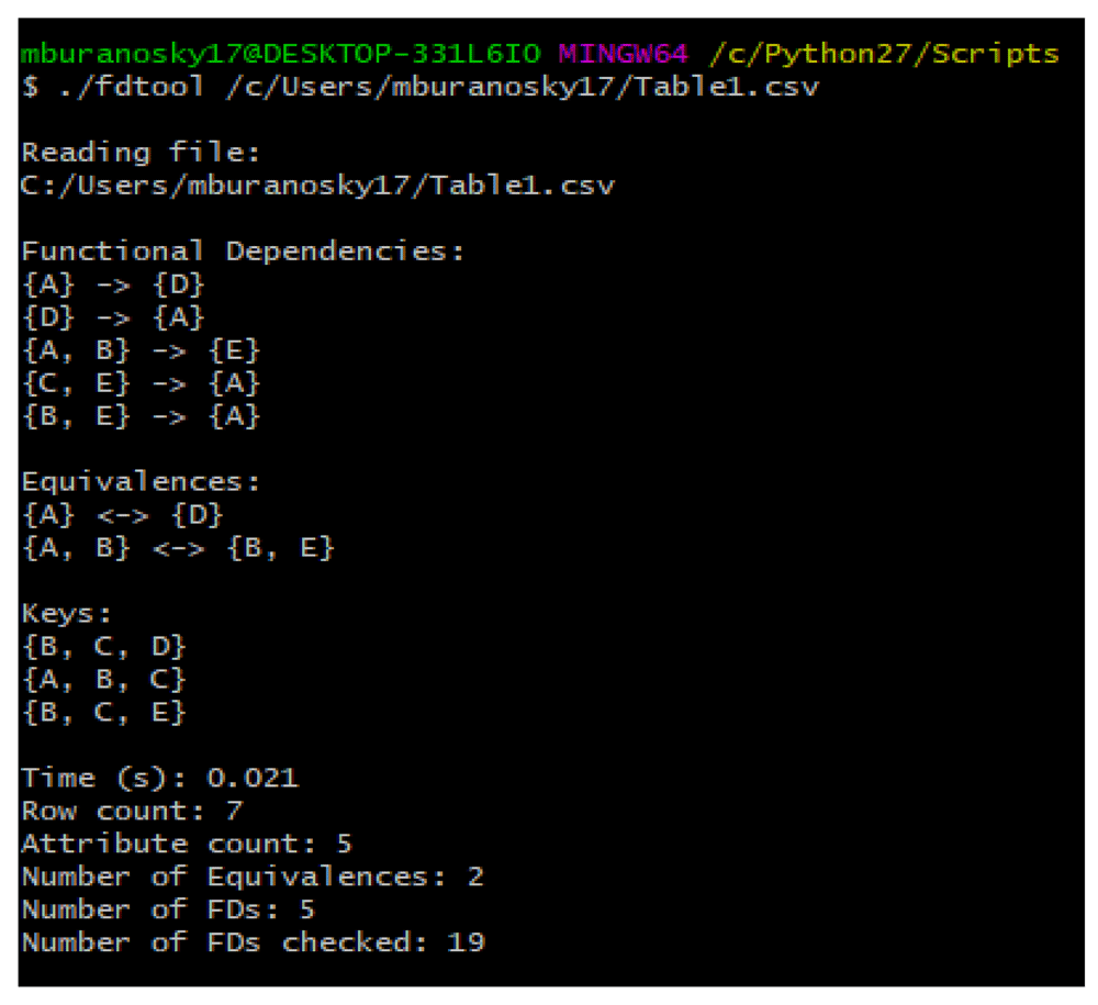 FDTool provides the user with the minimal FDs, equivalent attribute sets and candidate keys mined from a dataset. This is given with the time (s) it takes for the code to terminate (after reading in data), the row count and attribute count of the data, the number of FDs and equivalent attribute sets found, and the number of FDs checked. This is printed on the terminal after the code is executed as shown in Figure 3. The information is saved to a .FD_Info.txt file.