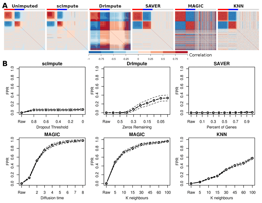 Of the methods we tested, SAVER was the least likely to generate false-positives, but it’s performance depended on how well data conformed to the negative binomial model it is based on. If imputation is used, combining SAVER with an effect size threshold is the best option to avoid irreproducible results. Alternatively, verifying the reproducibility of results across multiple datasets or multiple imputation methods can eliminate some false positives. However, our results highlight that statistical tests applied to imputed data should be treated with care. Although a previous benchmarking study showed good results for positive controls, our study highlights the importance of considering negative controls when evaluating imputation methods.
