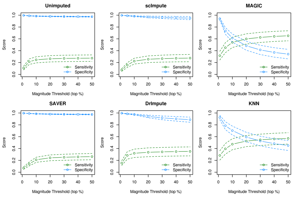 We found a trade-off between sensitivity and specificity across methods (Figure 2). MAGIC and knn-smooth which are data-smoothing methods, as such they adjust all expression values not just zeros. Since they impose larger alterations on the data, these methods generate many more false positives than methods which only impute zero values. However, they also have a greater sensitivity. In contrast, model-based methods which only impute low expression values, generated fewer false positives but had minimal improvements to sensitivity.
