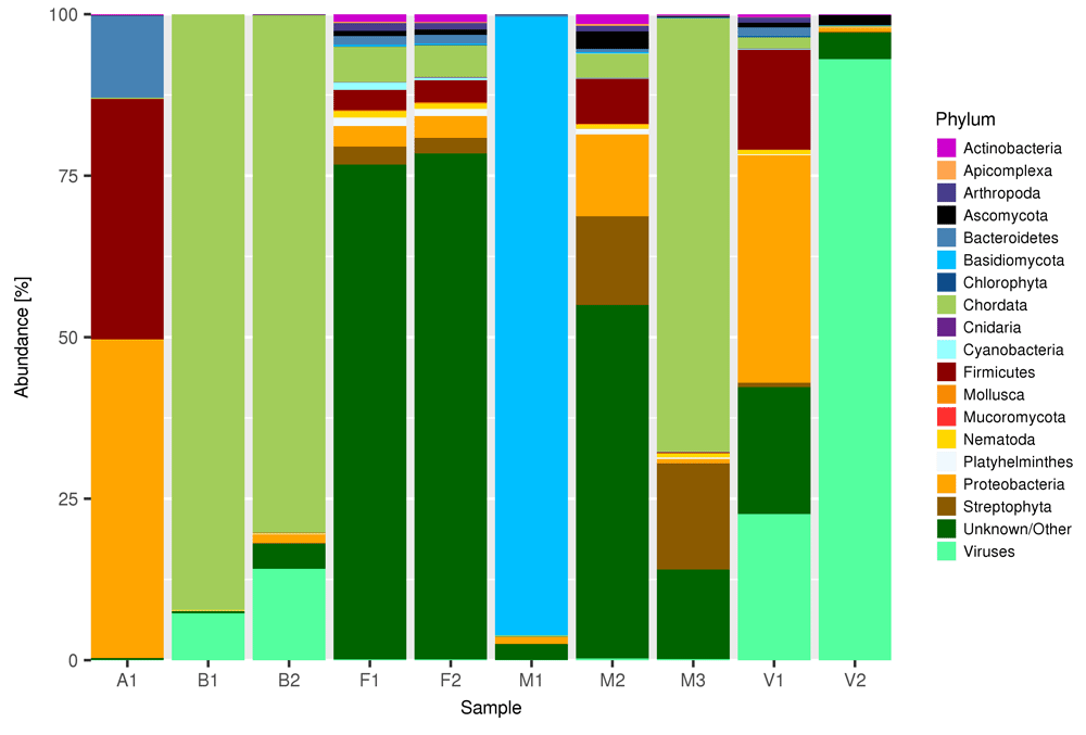 The number of reads obtained in the samples selected for the present study ranged from slightly more than 1 million (sample V1) to more than 12 millions (sample F1). The number of species identified in each sample was very high, ranging from 2,508 in sample B1 to 29,661 in sample F1. However, the 20 most abundant species accounted for a large proportion of the reads in each sample, from 74.62% in M2 to 99.75% in B1, and the 100 most abundant species accounted for 84.7% in M2 and 99.8% in B1. In sample A1 98.8% of the reads were assigned to the 20 declared species, and only 1.2% of reads were either unassigned or uncorrectly attributed to other species. To ensure that our conclusions have a general validity, we selected samples originating from very different sources with different compositions, and sequenced them at different depths. Figure 2 summarizes the composition of each sample at the Phylum level. Viruses are aggregated at the division level. Only phyla more abundant than 1% were plotted. Reads that were either unclassified or assigned to rare phyla were aggregated under the name “Unknown/Other”. Samples B1, B2 and M3 where mainly composed of Chordata, sample M1 was mostly composed by Basidiomycota, and sample V2 was mainly composed of Viruses. Samples F1, F2 and, to a lesser extent, M2 were characterized by a large proportion of reads unclassified or assigned to rare phyla. For a more detailed view of raw taxonomy composition, interactive html Chrona are available for download on Open Science Framework (https://osf.io/y7c39/), under the project “Do you cov me”, DOI: 10.17605/OSF.IO/Y7C39.