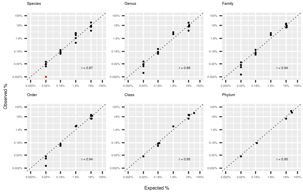 Figure 3 shows the scatterplot (in logarithm scale) of the observed and expected abundance of organisms of the mock community at different taxonomic levels, from Sepcies to Phylum when using the full-dataset (4.9 M of reads). The correlation between the two measures is high even at the species level (r=0.87), and increases for higher taxonomic levels reaching 0.95 at Class and Phylum level.
