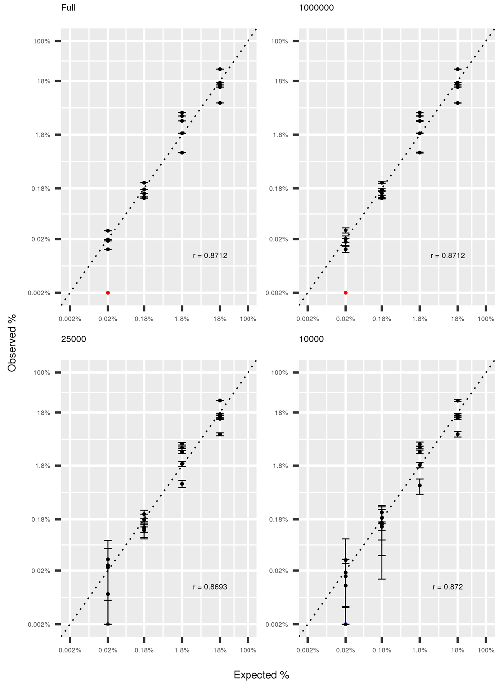 The correlation between expected and observed abundancies of the 20 mock species remained high when decreasing sequencing depth, and Pearson’s correlation coefficient remains stable at 0.87 at all the investigated sequencing depths. Results for the hwole depth, 1,000,000 reads, 25,000 reads and 10,000 reads, together with 95% intervals are shown in Figure 4.
