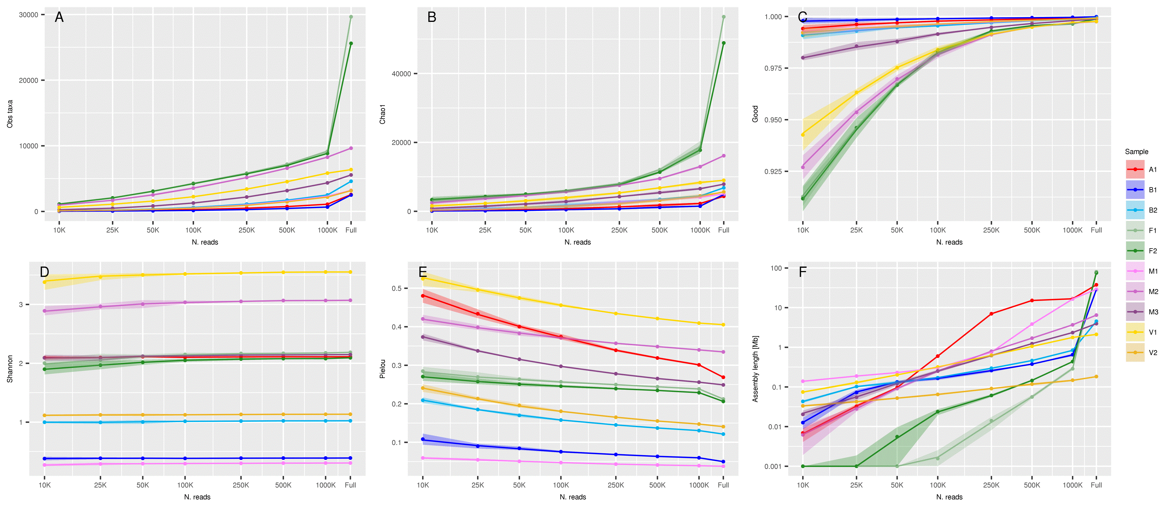Figure 5 shows the variation of several summary statistics as a function of the number of reads used for the analysis, from the smallest (10,000 reads) on the left, to the full dataset on the right. Panels A and B show the observed number of taxa and the value of Chao1 (expected number of taxa) respectively. The two measures have very similar trend, with a swift decrease in horse feces (F1 and F2) when going from full set to 1,000,000 reads, and a relatively slow decrease in all other samples and subsets.
