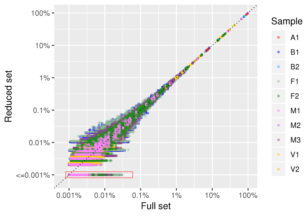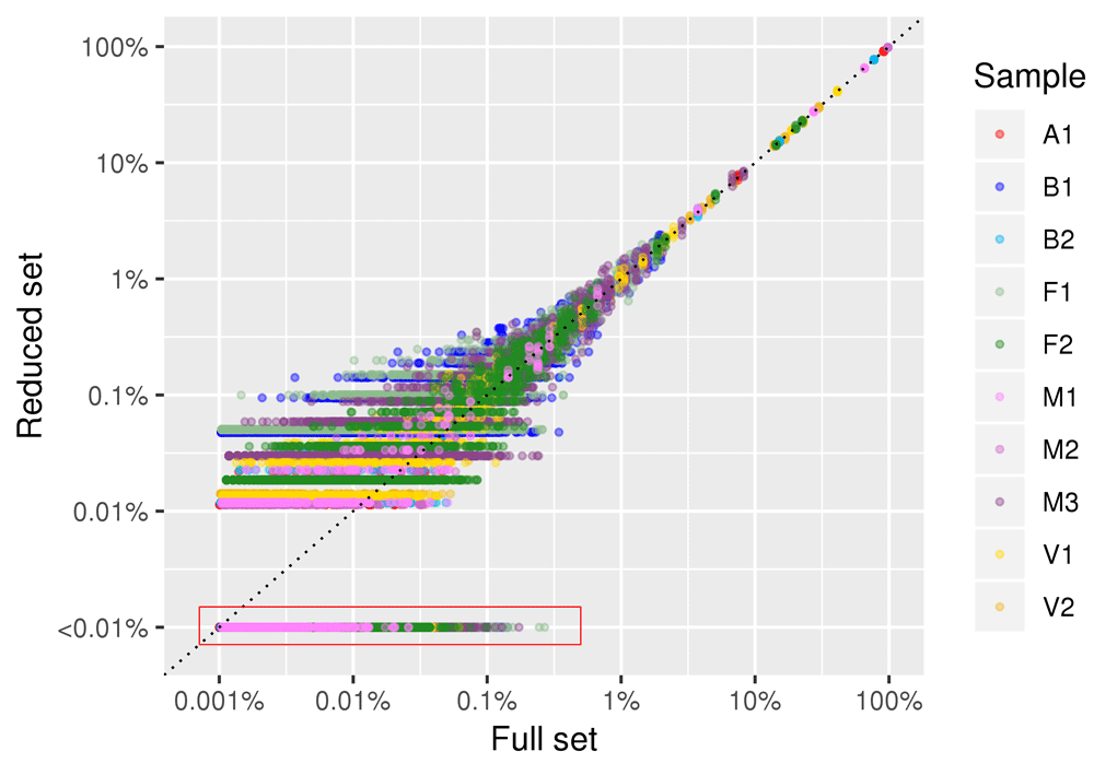 Figure 6 shows the correlation in species abundance estimation between the full dataset and a reduced dataset of 100,000 reads. The linear correlation coefficient between the two datasets was >0.99 in all five subsampling replicates. The plot is in log-log scale to emphasize differences in low abundance species. Only the relative abundance estimation of species with frequencies lower than 0.01% (i.e . species represented by 1 read out of 10,000) was affected by subsampling. The same pattern was observed in all examined samples.