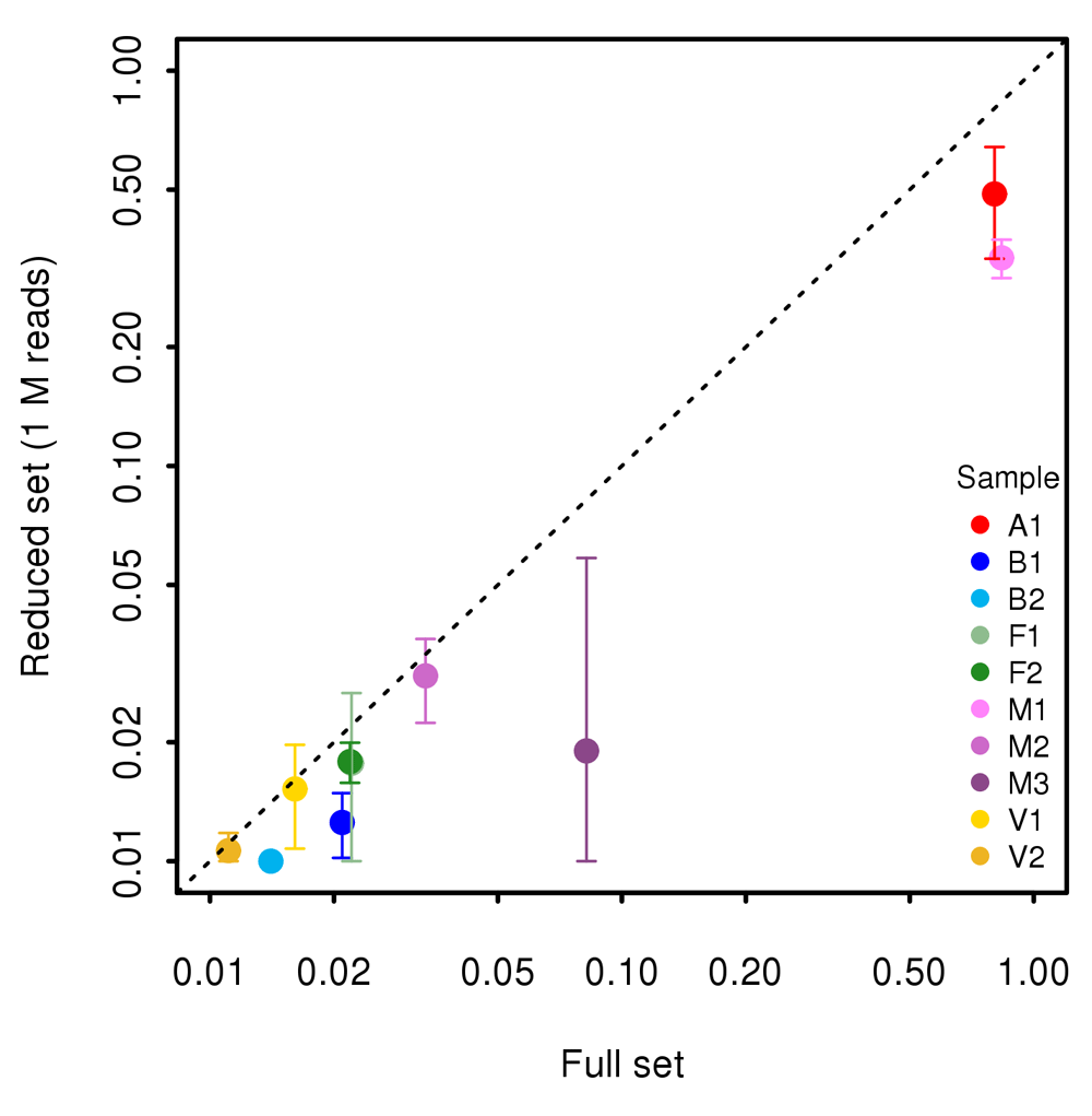 In Figure 7 we show the results obtained by reducing the number of sampled reads to 10,000 reads per sample. Similarly to what we observed for 100,000 reads depth, the linear correlation coefficient between species abundance estimate in the full and the reduced dataset was high (r>0.95) for all the samples and in all five subsampling replicates. Only rare species with frequencies lower than 1/1000 (0.1%) in full dataset showed some deviation.